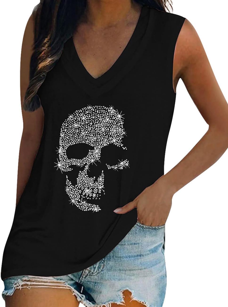 Fronage Women's Rhinestone Skull Tank Tops Loose Graphic V Neck Sleeveless Tee Shirt