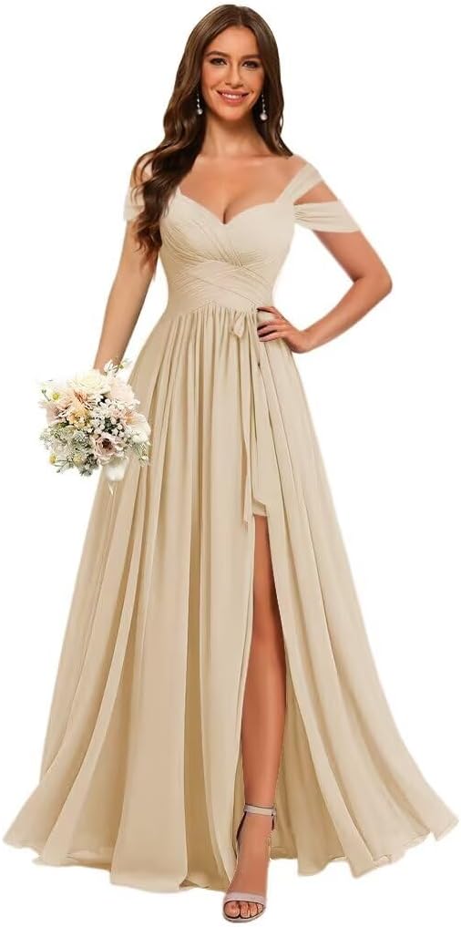Women's Off Shoulder Bridesmaid Dress with Belt Chiffon Ruched Formal Evening Gowns YY004