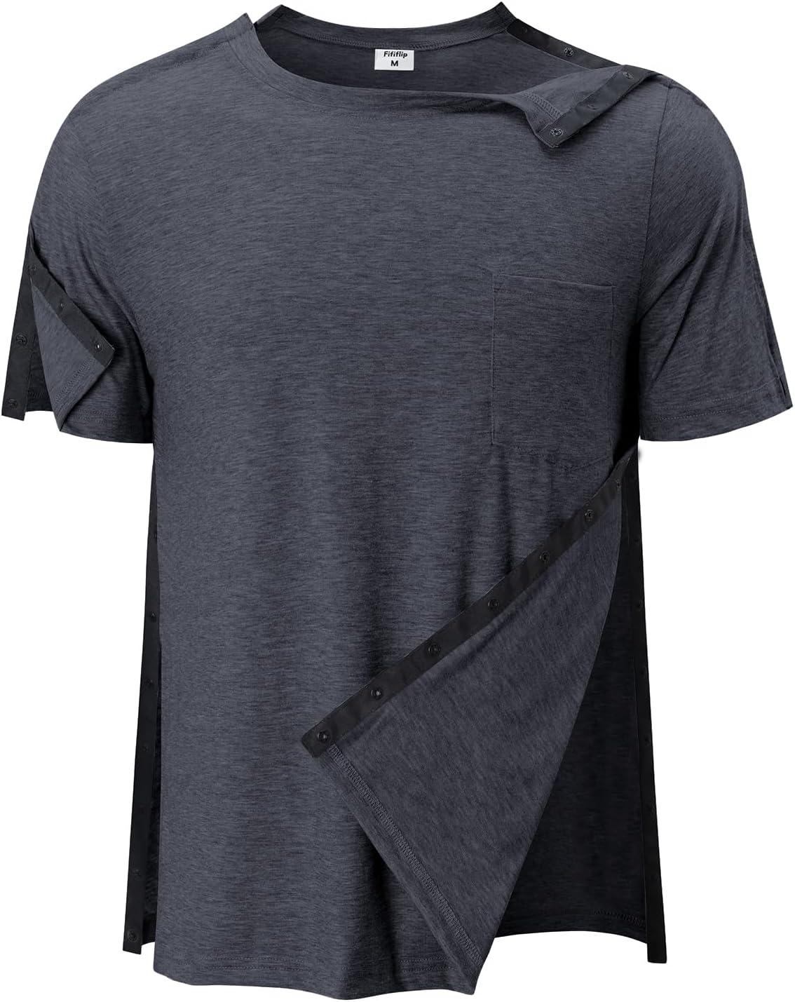 Men's Post Shoulder Surgery Shirts Tear Away Recovery Short Sleeve Full Open Side Snap Chemo Shirt Adaptive Clothing