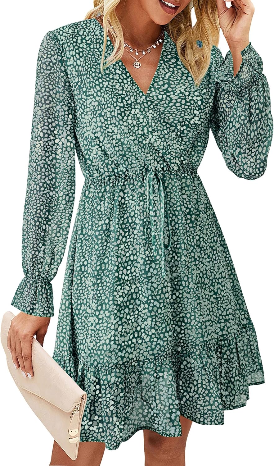 KIRUNDO Women Casual Summer Fall Dresses Long Sleeve Floral Wrap V Neck High Waist Ruffle Tiered A Line Flowy Mini Dress