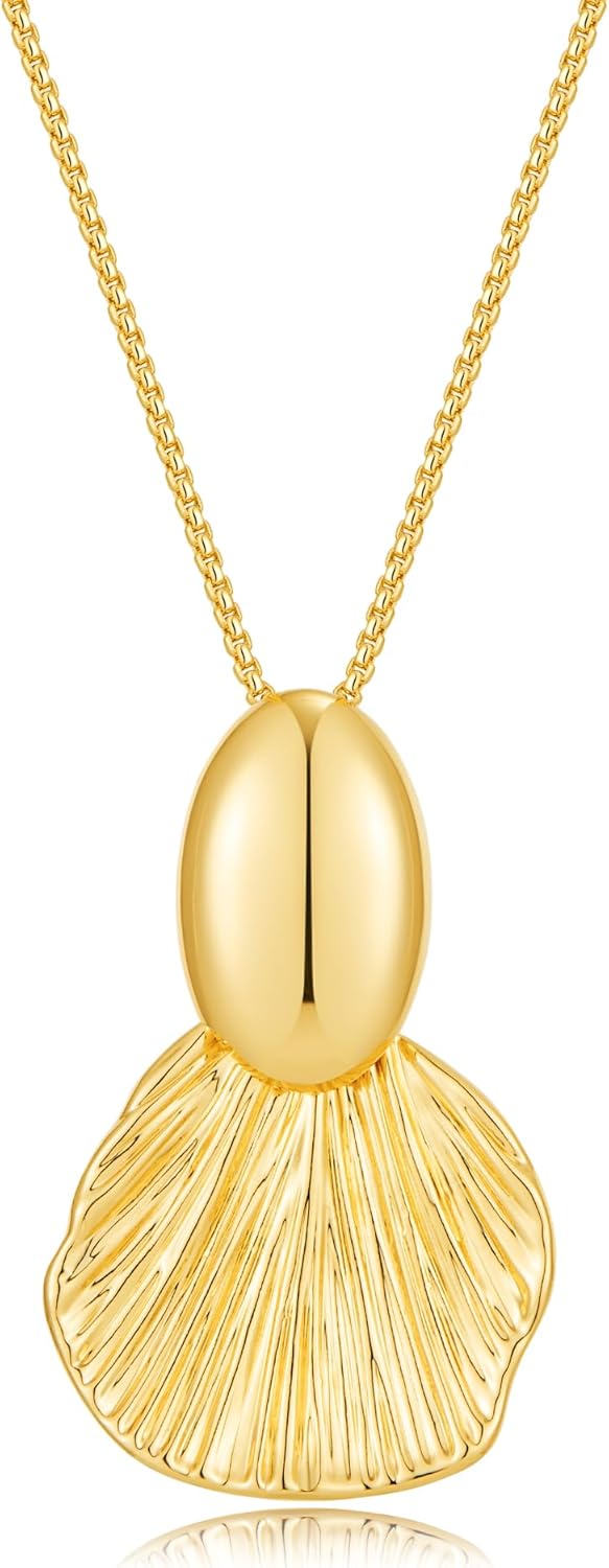 Gold Pendant Necklace for Women- Shell Fan-shape, 14K Gold Plated Textured Statement Leaf Jewelry