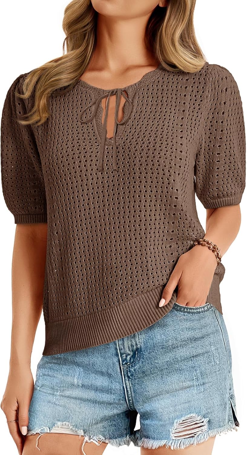 Saodimallsu Womens Crochet Sweaters Puff Short Sleeve V Neck Tie Front Lightweight Casual Summer Trendy Knit Tops