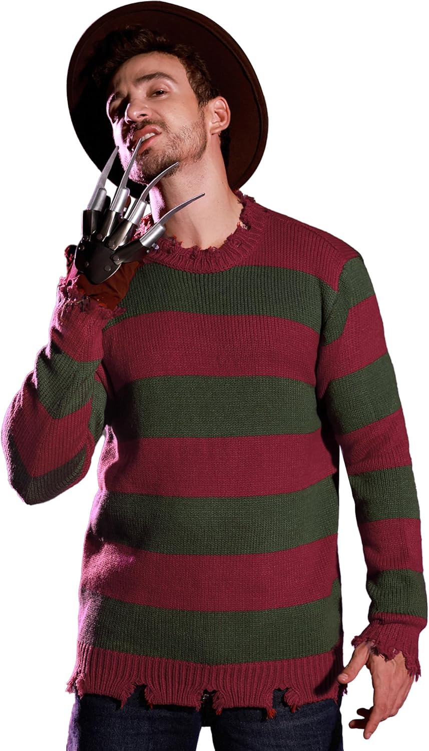 Arvilhill Men's Freddy Costume Halloween Nightmare Funny Striped Pullover Scary Terifier Classic Elm Horror Knitted Red Green Sweater L