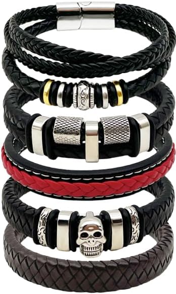 Leather Bracelets for Men 5pcs, Fashion Men's Bracelet Leather and Steel Braided Wrap Cuff Wirstband Bracelets with Closure Bangle Gift for men