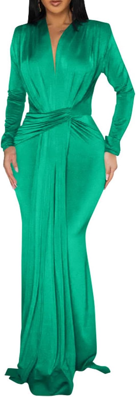 Memoriesea Women's Elegant Long Sleeve Deep V Neck Bodycon Party Evening Gown Maxi Dress