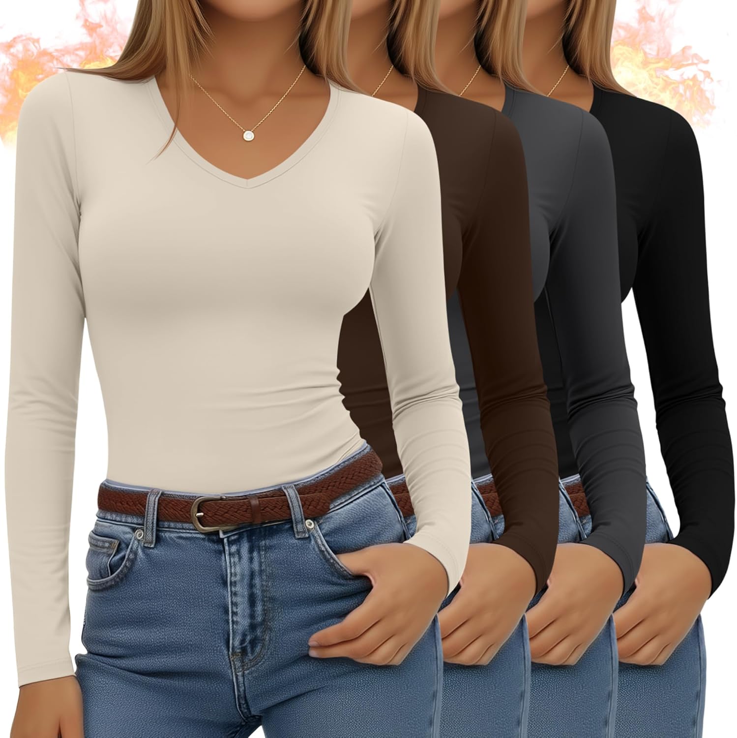 4 Pack Women's Long Sleeve Thermal Shirts Fleece Lined V Neck Slim Fit Underwear Base Layer Basic Winter Warm Tops