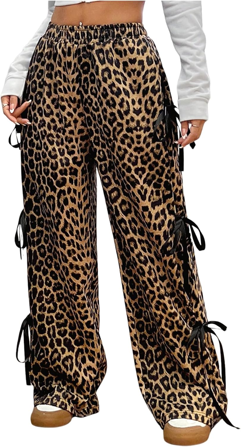WDIRARA Girl's Leopard Print Bowknot Wide Leg Pants Y2k Elastic Waist Baggy Pants