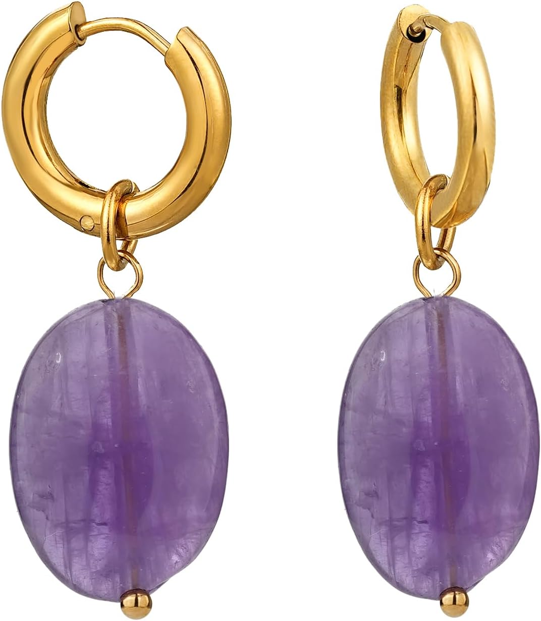 Oval Birthstone Natural Gemstone Earring for Women 18k Gold Plated Huggie Hoop Drop Jewelry Valentine's Day Birthday Gift for Wife Girlfriend Mother