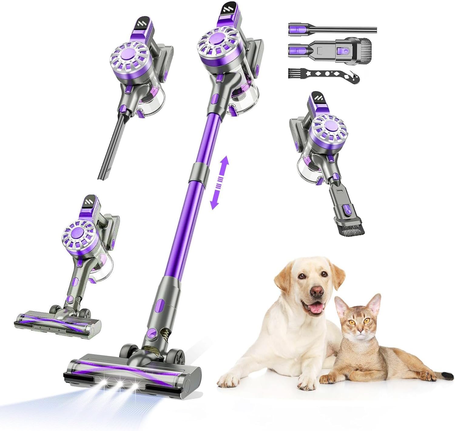 5.6 Pound Lightweight Design; Flexible Rotating Floor Brush with 3 LED Light; 2 Suctions Mode; One Button Empty Dust Cup; 5-Layer High-Efficiency Filtration System; 6*2200mAh Removable Battery; WALL-MOUNTED Storage; 0.8L Dust Cup; 4-5 Hours Full Charge; Adjustable Telescopic Pole; 12Kpa Turbine Suction; 2-Year Quality Guarantee;