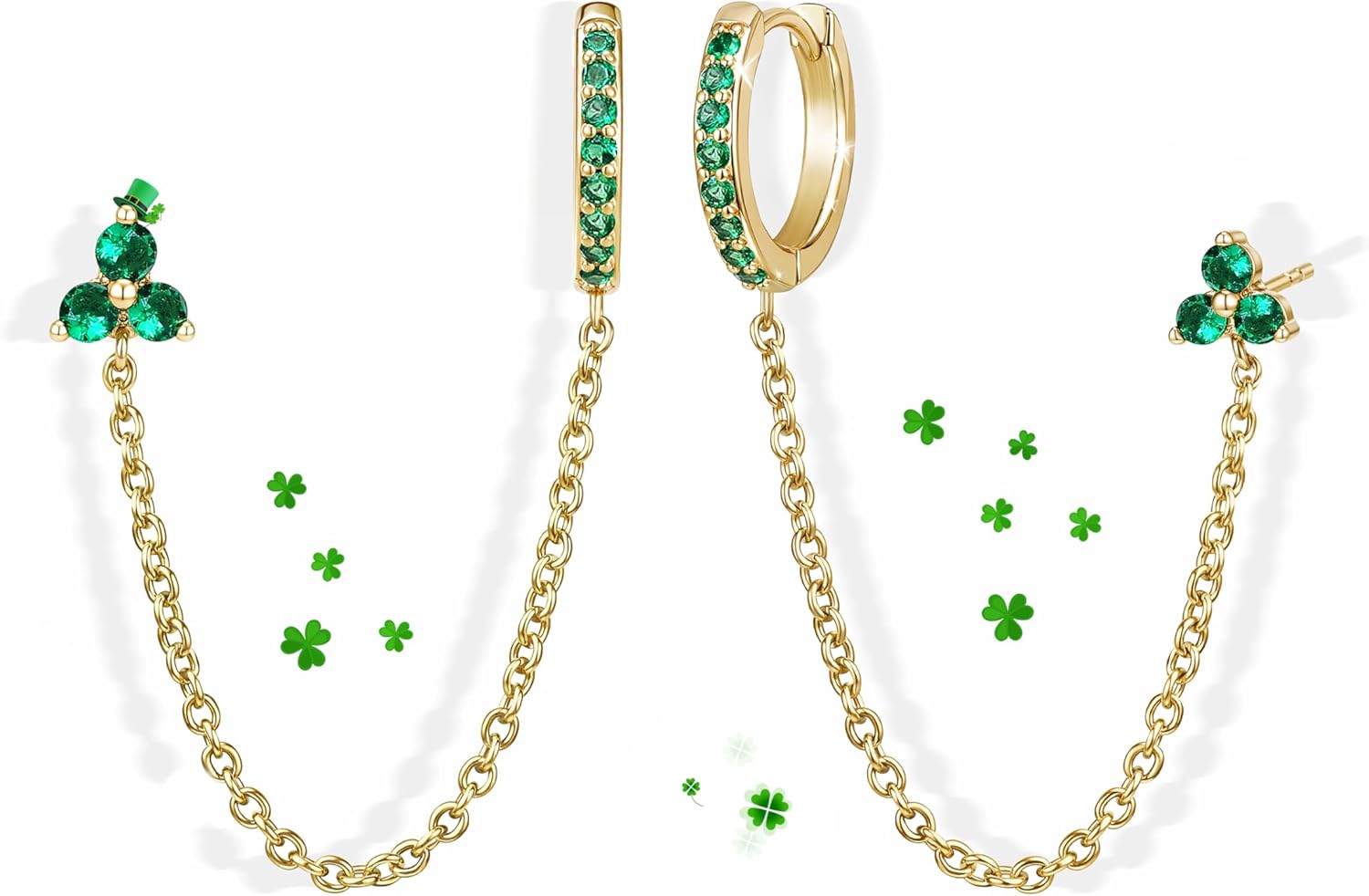 Gold Chain Earrings for Women, Hypoallergenic Huggie Hoop Stud for Catilage Conch Double Piercing, St. Patrick's Day Sterling Silver Chain Earring Jewelry