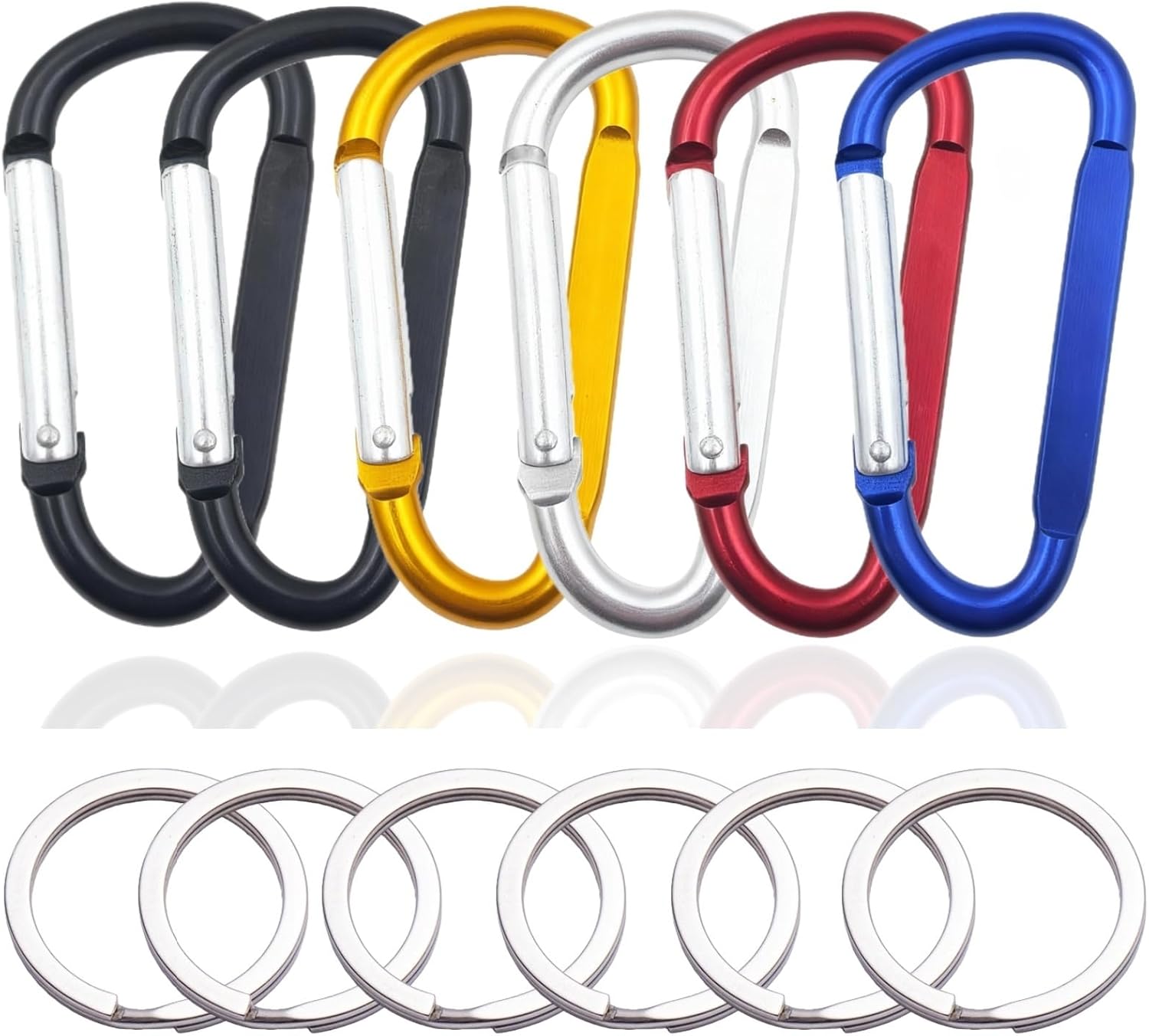 - 1. Complete Carabiner Set: This versatile set includes 6 large 3-inch D-ring carabiner clips and 6 silver key rings, perfect for organizing your everyday essentials. The pack features 2 black, 1 silver, 1 gold, 1 blue, and 1 red carabiner, offering stylish options for your gear.