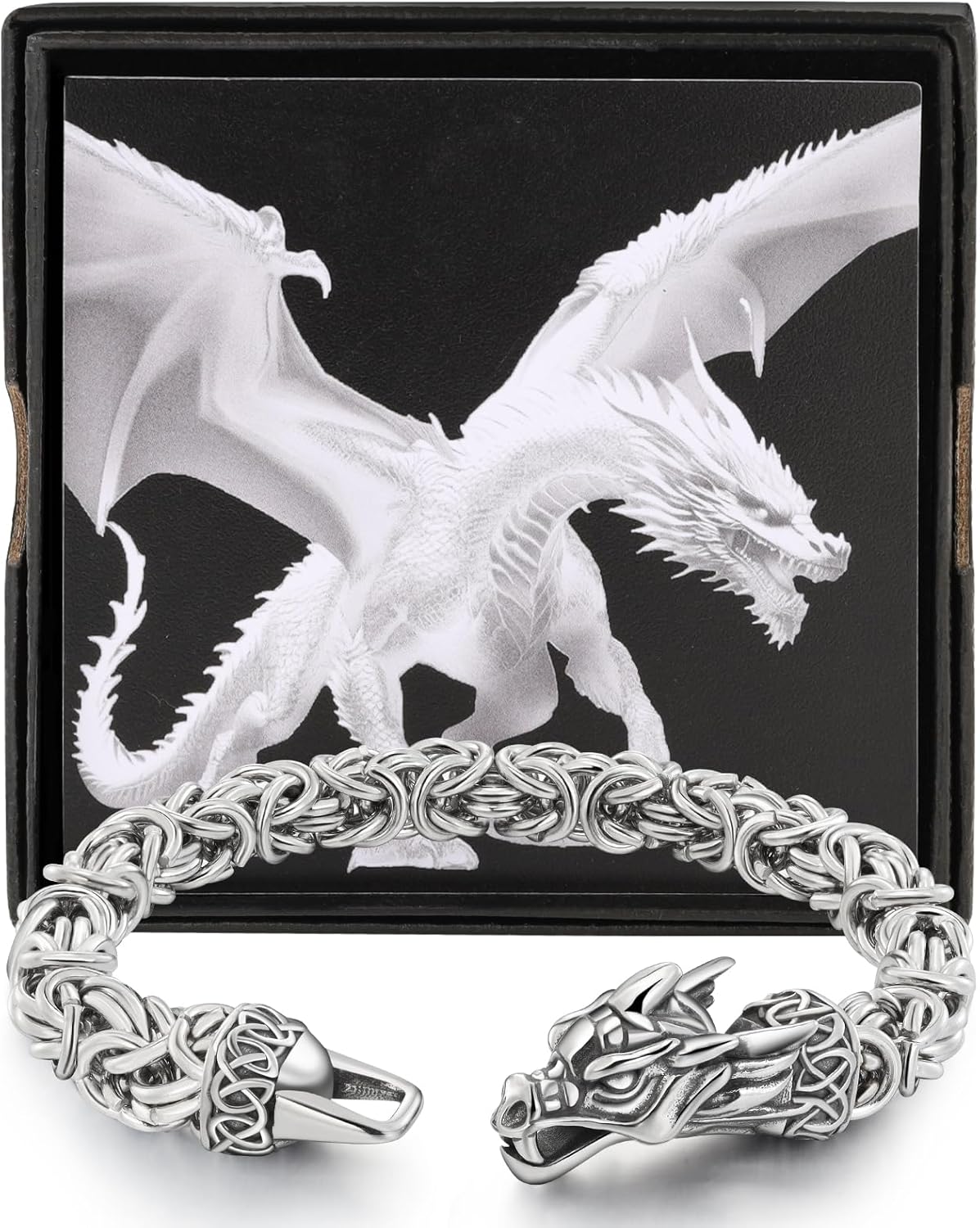 Handmade Dragon Bracelet for Men, 316L Stainless Steel Byzantine Chain, Vintage Black/Silver Finish, 8mm Width, 8.4 Inch Length, Norse Viking Wristband Jewelry Gifts for Husband
