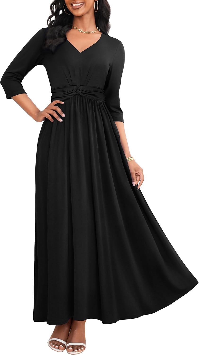 FANDEE Casual Maxi Dress for Women Summer Wtih Pockets 3/4 Sleeve V Neck Elastic High Waist Elegant Pleated A-Line Dresses