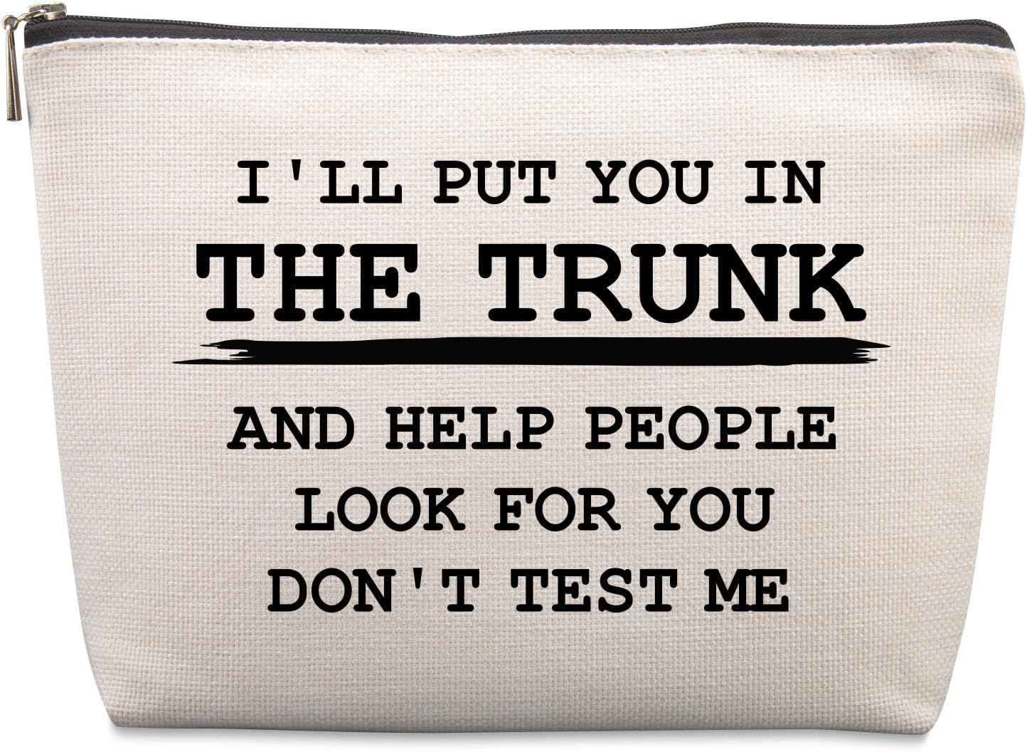 - 【Funny Gifts for Friends】: This funny birthday gifts makeup bag specifically designed for humorous themes and printed with "I'LL PUT YOU IN THE TRUNK AND HELP PEOPLE LOOK FOR YOU DON'T TEST ME", full of elements of simplicity and elegance. What's more, it is the beautiful item for every season all the year and funny friendship gifts ideas. Making it a stylish and meaningful accessory for your best friend!