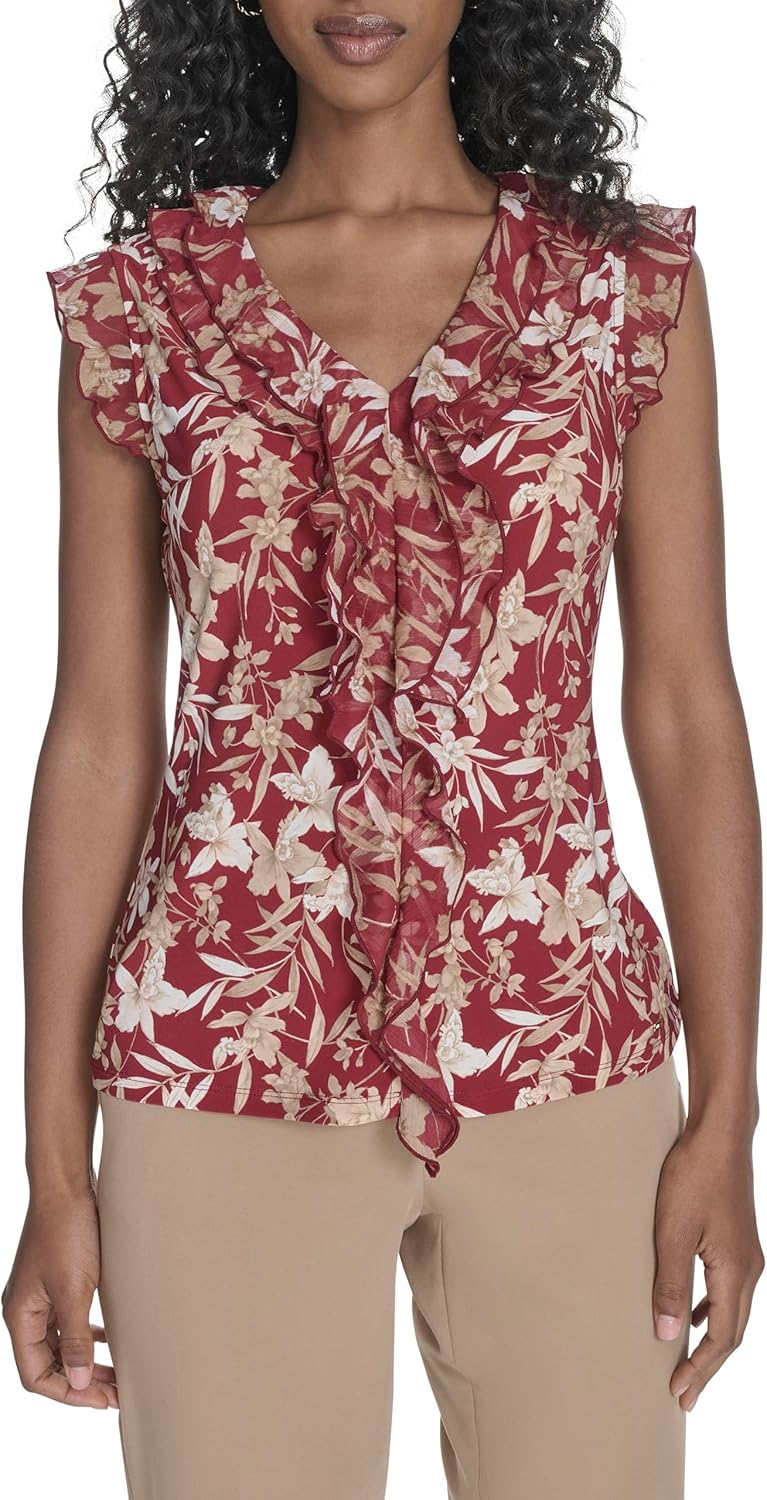 Tommy Hilfiger Women's Sleeveless Mix Media Ruffle Front Blouse