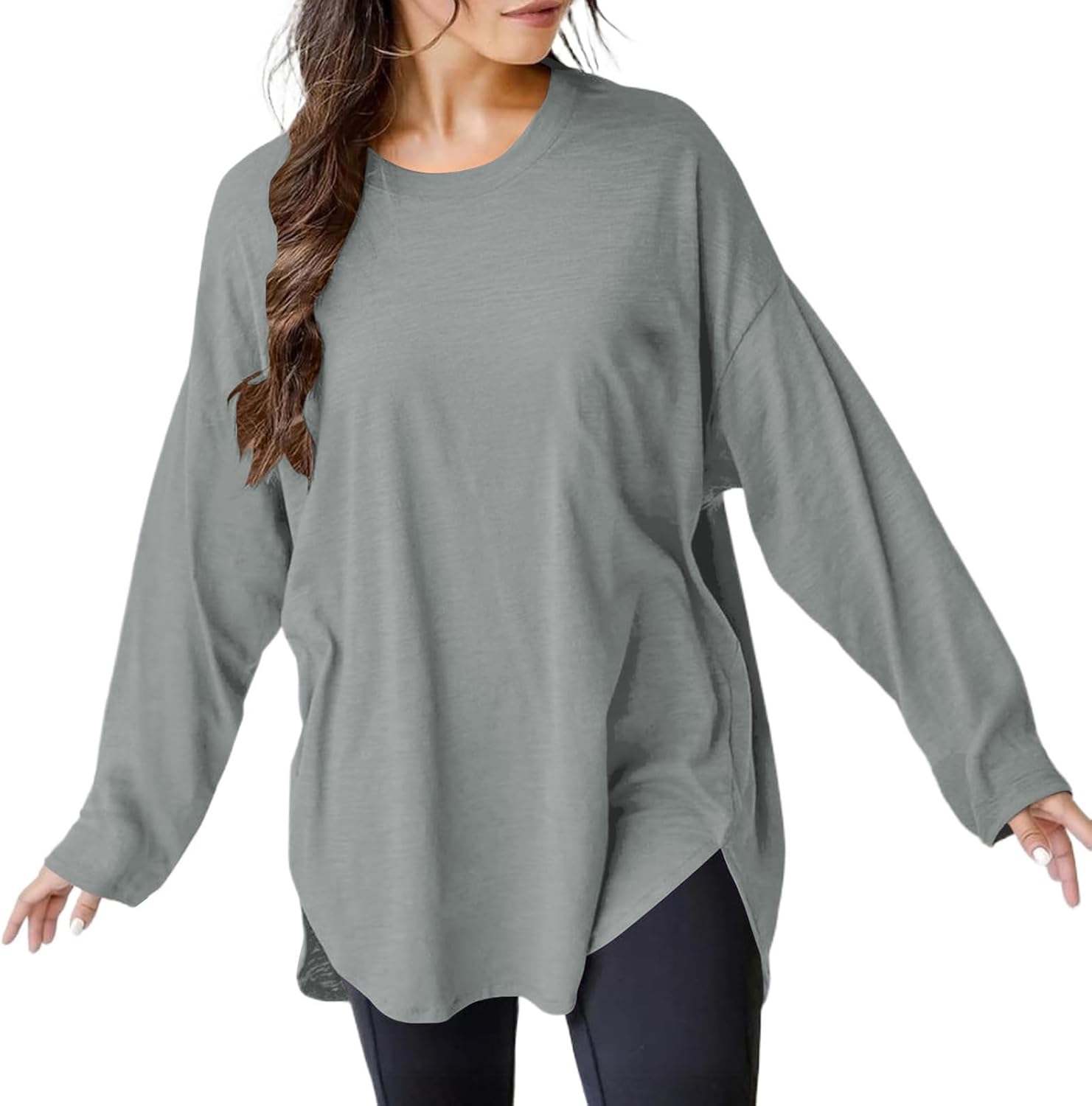 VNIRA Oversized Long Sleeve T Shirts for Women Side Split Round Hem Crew Neck Cotton Work Out Casual Fall Tunic Tops