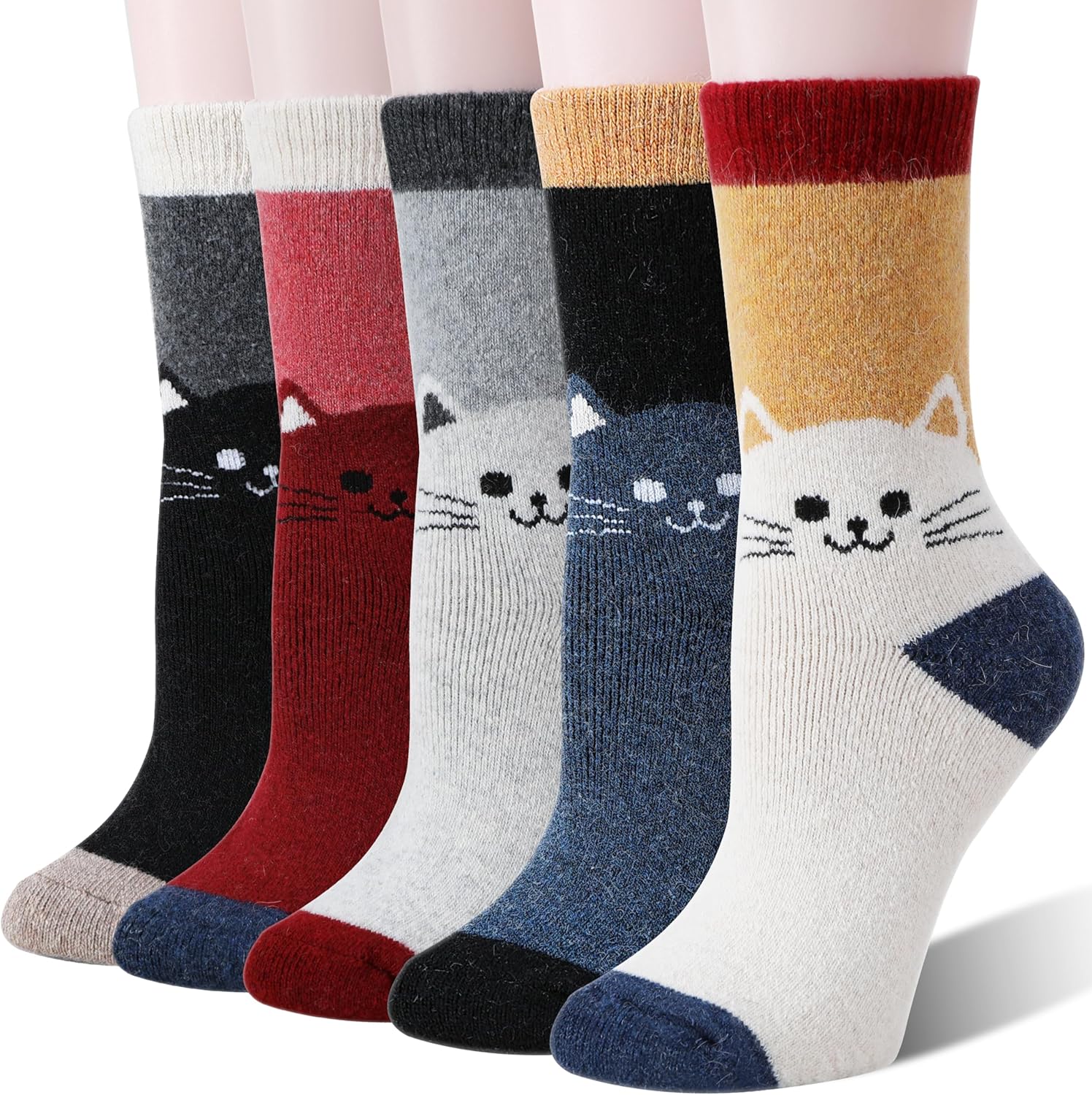 Women Merino Wool Cat Socks Thermal Winter Warm Thick Cozy Cute Fun Crew Boot Socks 5 Pairs