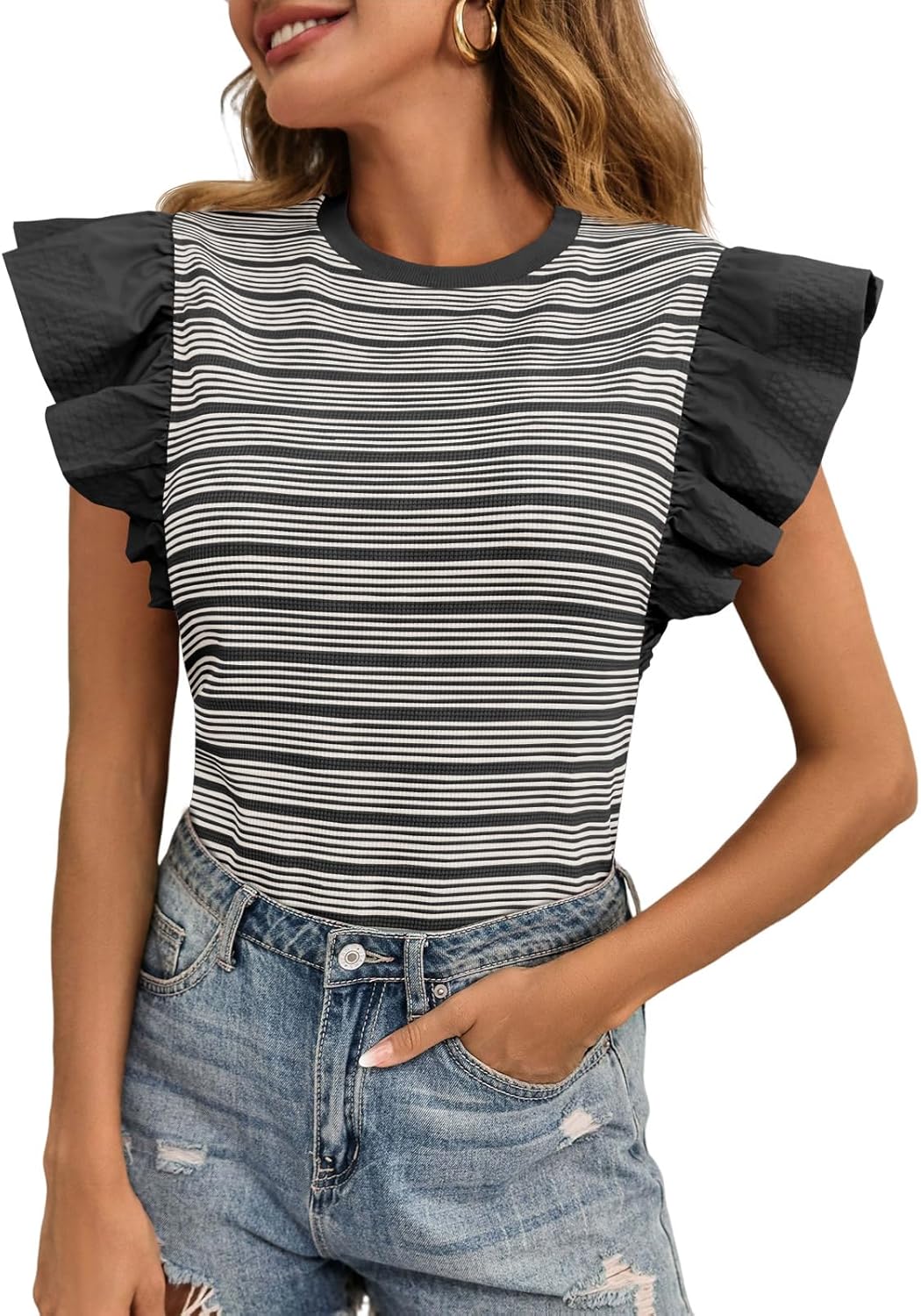 Tankaneo Womens Ruffle Striped Tank Tops Summer Crew Neck Sleeveless Shirts Loose Fit Dressy Casual Blouse