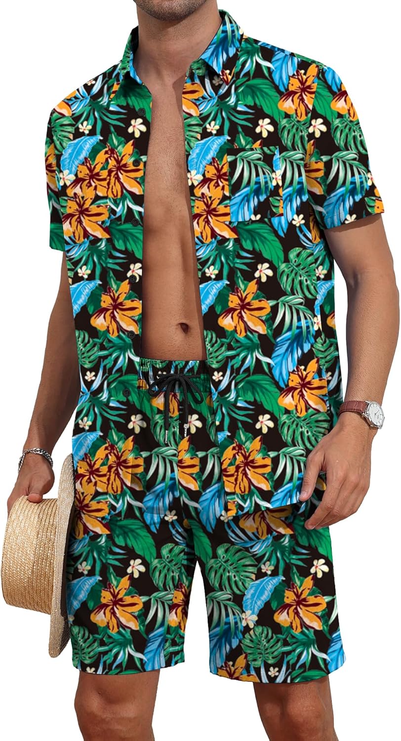 YTD Mens Flower Hawaiian 2 Piece Outfit Sets Short Sleeve Beach Casual Button Down Shirt and Shorts Suits