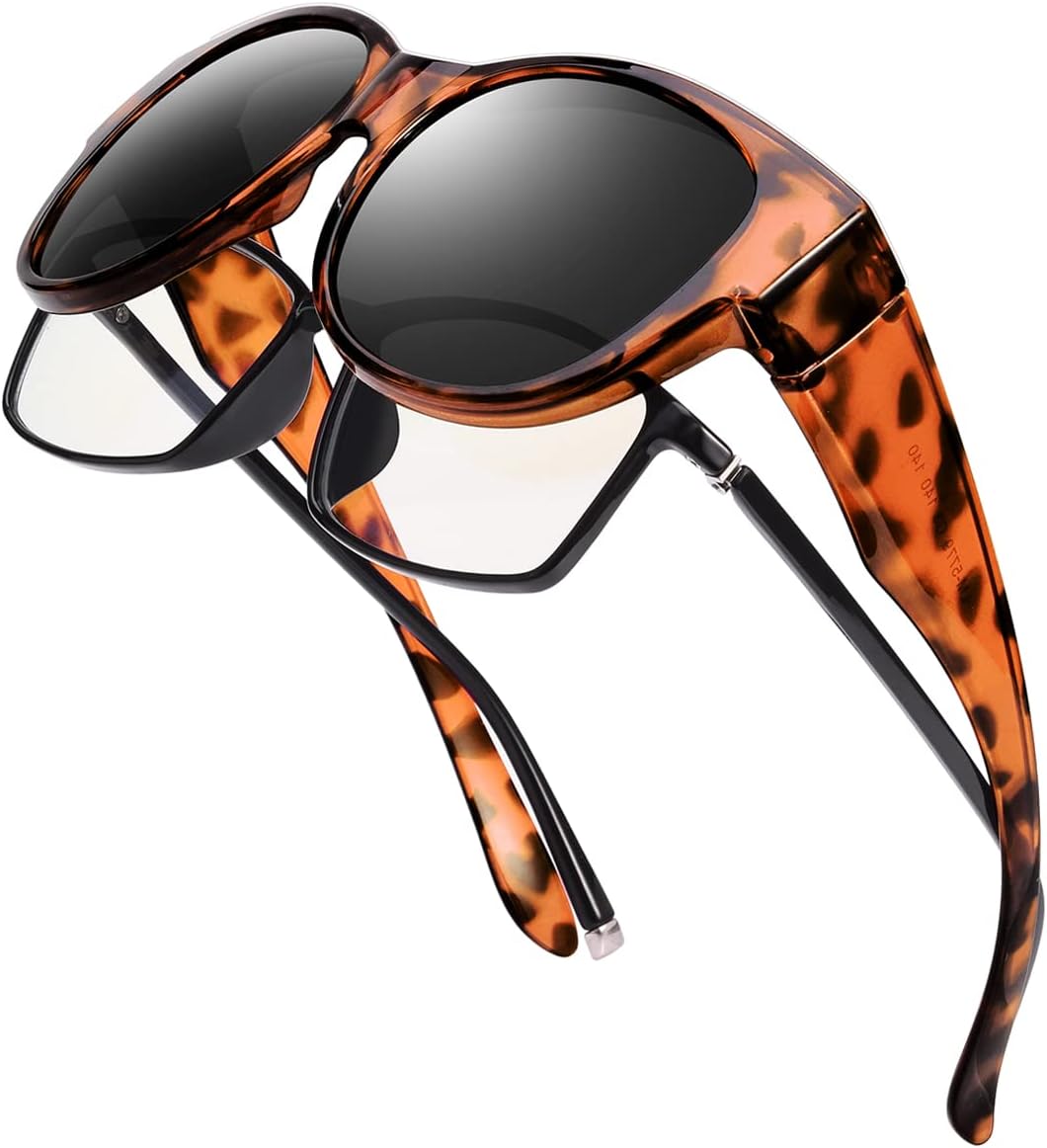 - Over Glasses Sunglasses: These wrap-around sunglasses with large lenses(lens height: 2.01inch&lens width: 2.24inch) can be easily worn over women and men’s prescription glasses. Fully cover over your myopic glasses or reading glasses without sliding off. Fit over most styles of eyeglasses, such as cat-eye style, square, oval or round prescription glasses.