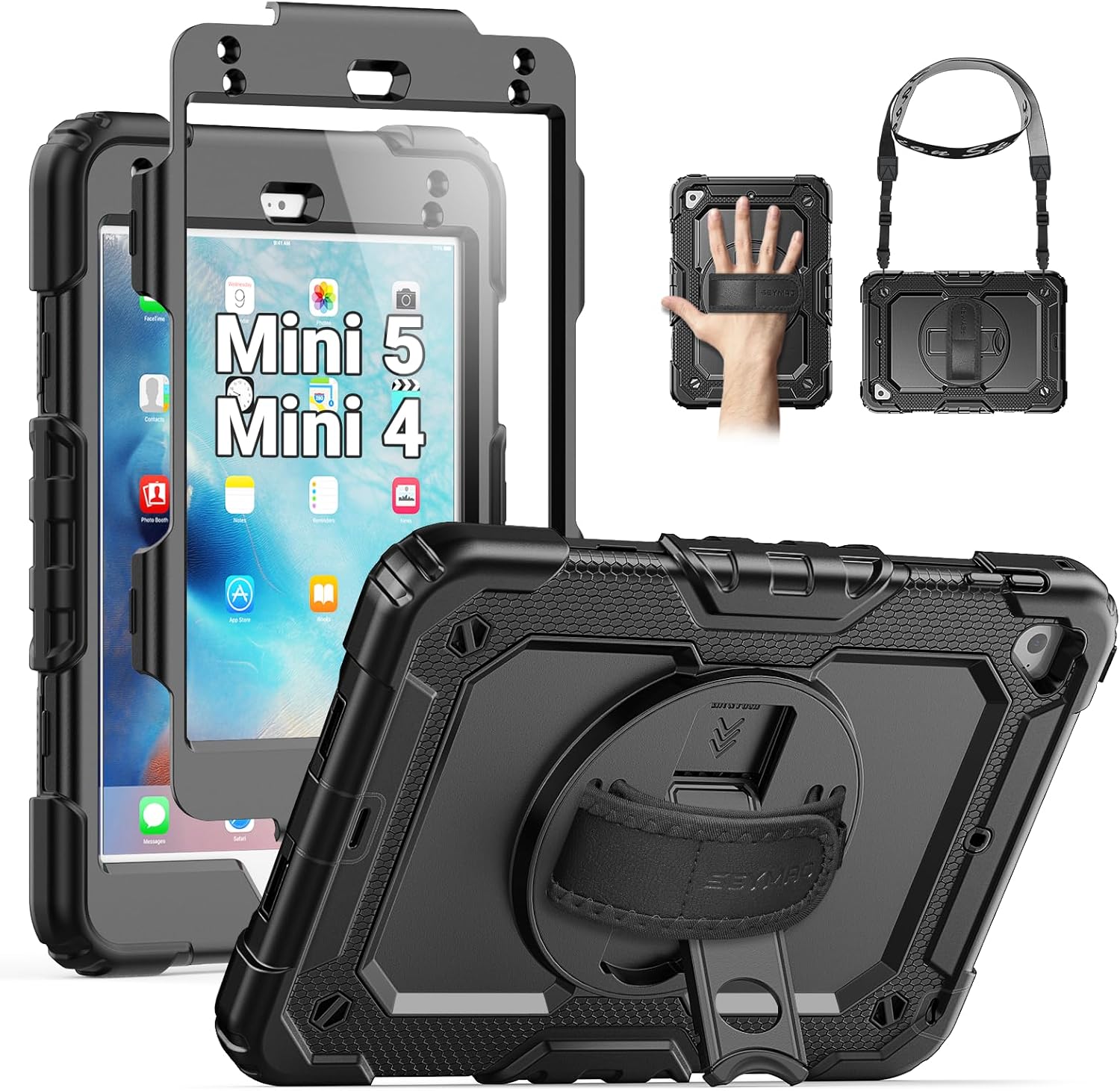 SEYMAC for iPad mini 5/ Mini 4 Case 7.9 Inch, Heavy Duty Shockproof Full-Body Protective Case with Screen Protector, 360° Rotating Stand, Hand/Shoulder Strap for iPad mini 5th/ 4th Generation, Black
