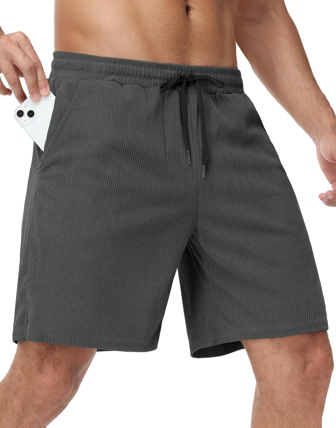 JWM Men's 7" Corduroy Shorts - Stretch Lightweight Elastic Waist Casual Summer Beach Drawstring Shorts with Zip Pocket