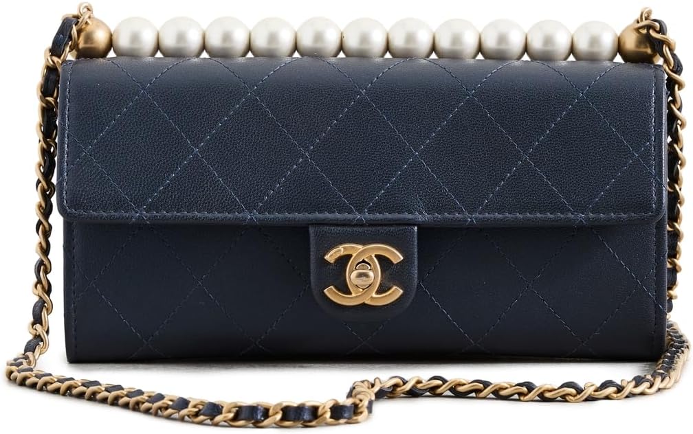 CHANEL What Goes Around Comes Around Women's Pre-Loved Navy Calfskin Chic Pearl Wallet On Chain