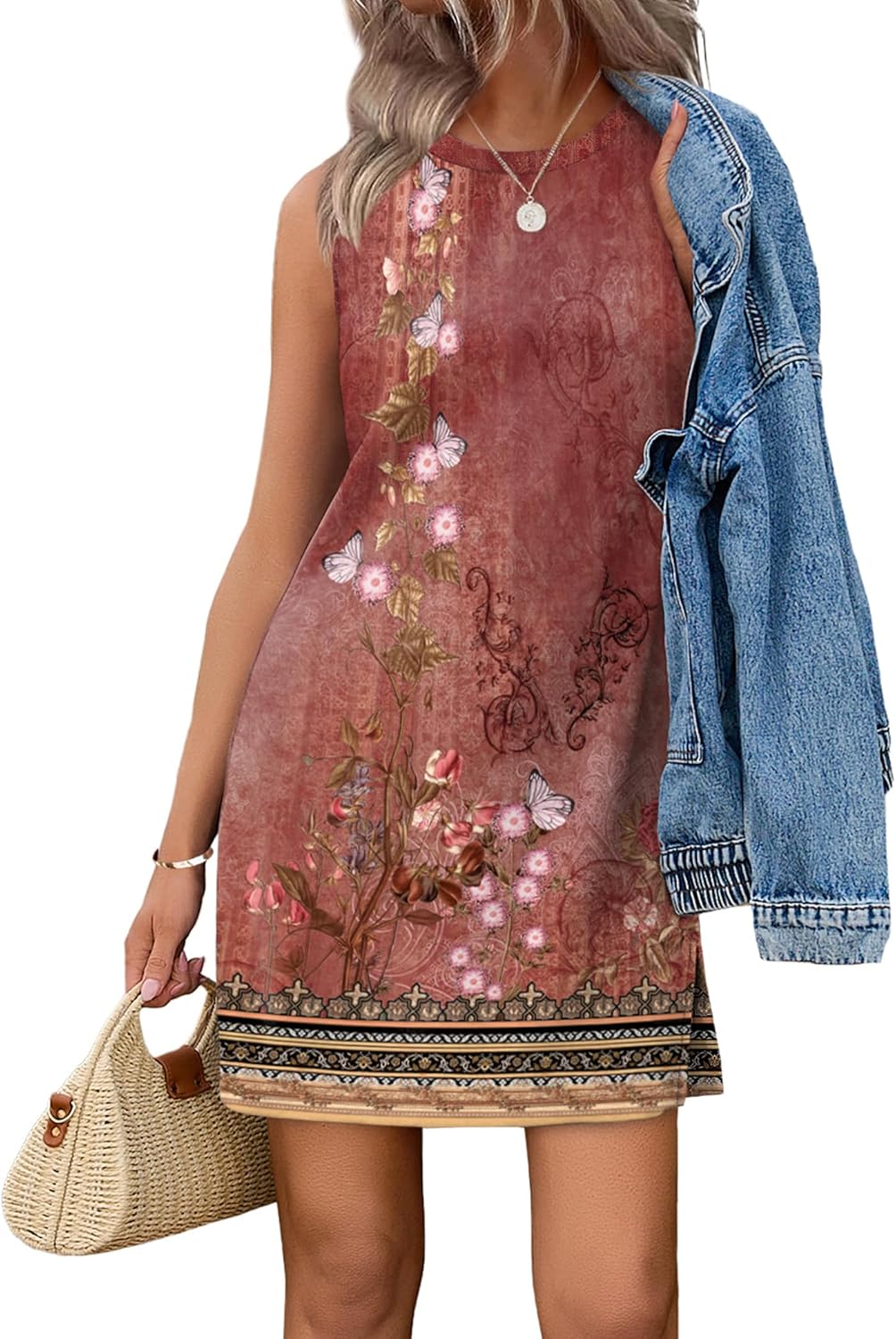 WIHOLL Casual Dresses for Women Crewneck Sleeveless Tank Dress Summer Spring Boho Vacation Clothes