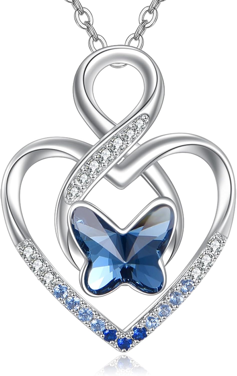 VONALA Butterfly Necklace for Women 925 Sterling Silver Blue Crystal Heart Necklace Butterfly Jewelry Gifts for Her
