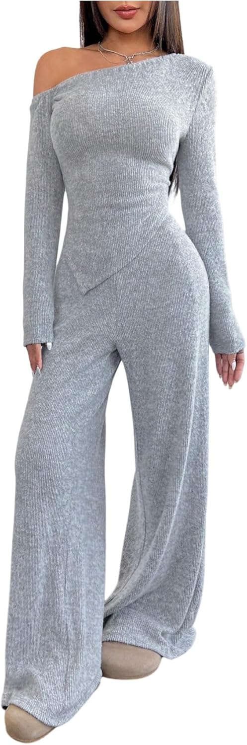 Milumia Women's 2 Piece Outfit Off Shoulder Long Sleeve Asymmetrical Knit Top Pants Sets