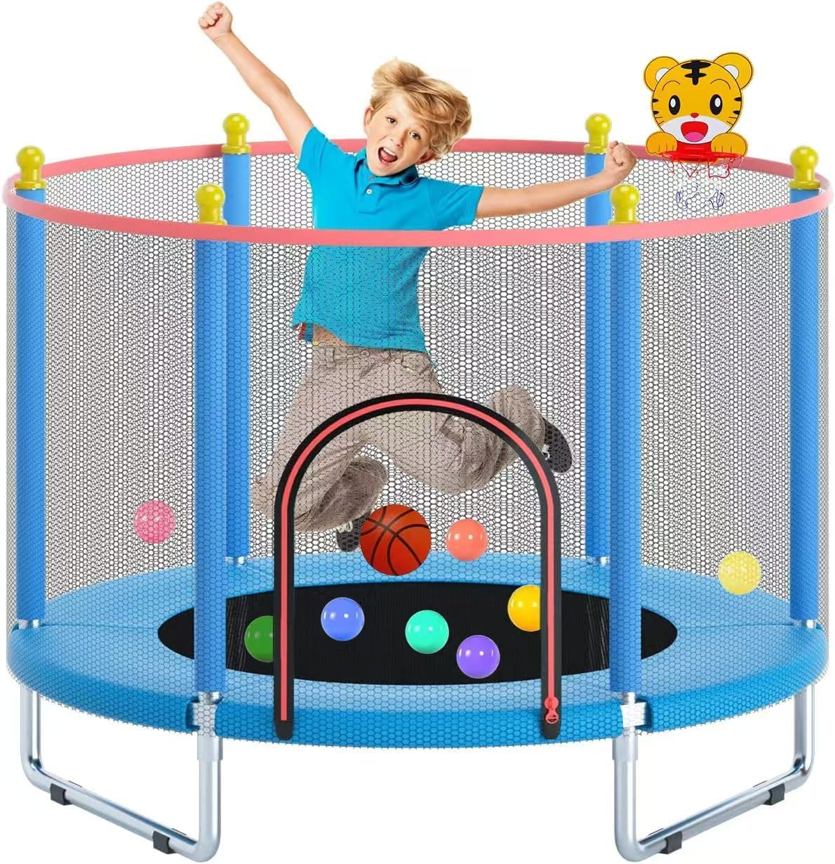 55" Trampoline for Kids, Telawah Indoor/Outdoor Mini Baby with Safety Enclosure Net, Adjustable Toddler with Basketball Hoop, Gifts for Boys & Girls
