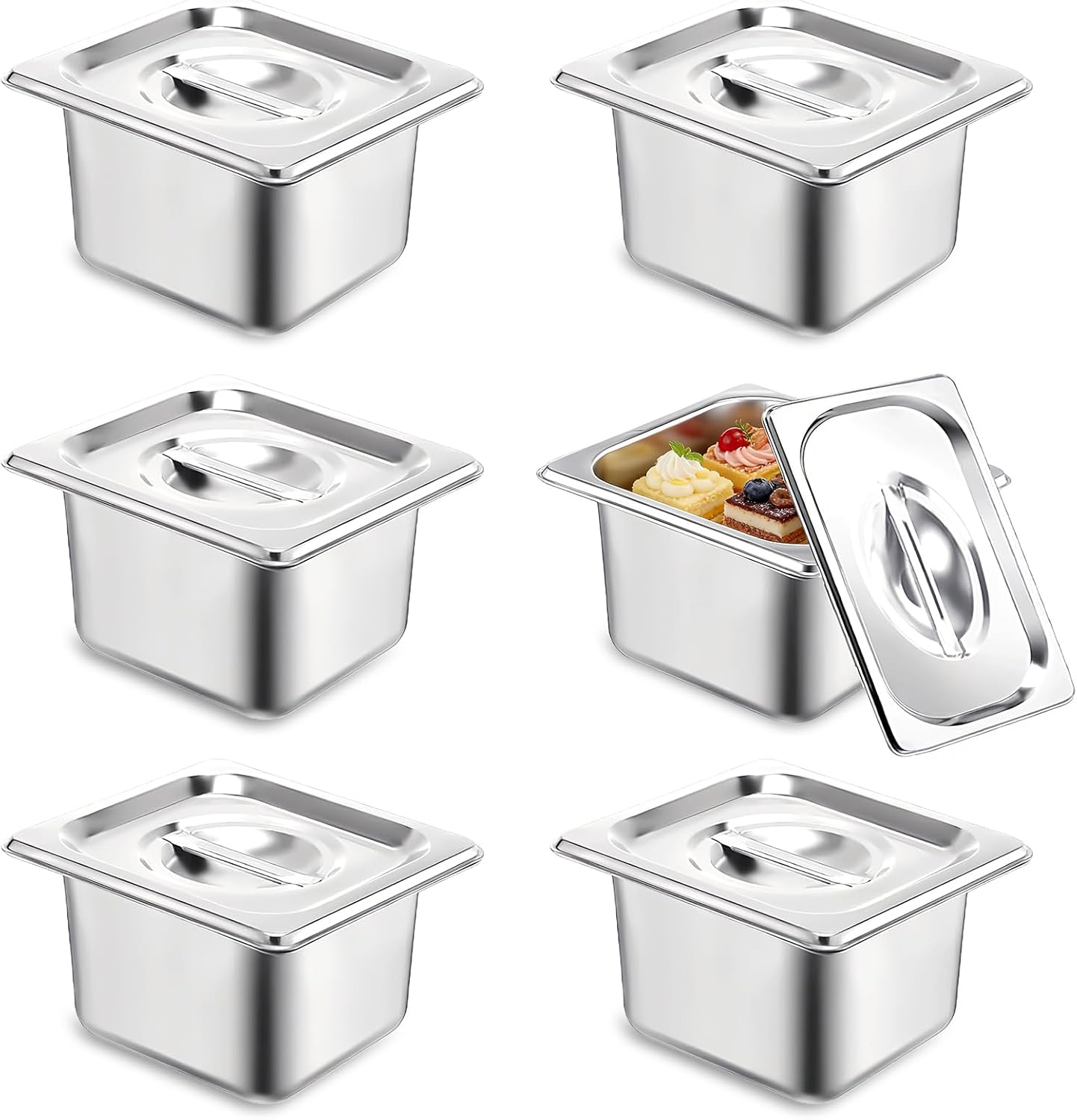 6 Pack Hotel Pans with Lid, 1/6 Size Steam Table Pan Set for Food, 4 Inch Deep Commercial Catering Pan Stainless Steel Table Steam Pans for Hotel, Buffet, Restaurant and Party