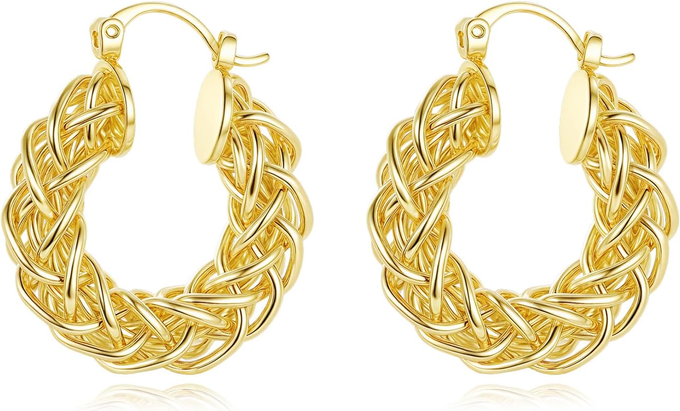 14K Gold Hoop Earrings for Women Chunky Lightweight Statement Earrings Woven Gold Hoops Hypoallergenic Jewelry Gift for Her