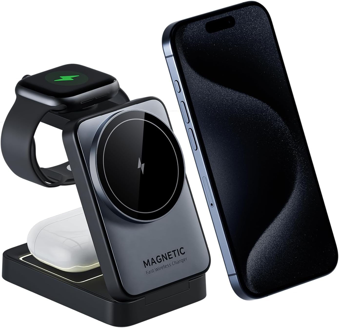 - 【Fast Wireless Charger Foldable Stand】Effortlessly charge for iPhone at a lightning-fast 15 W, for Apple Watch at a reliable 2.5 W, and for AirPods at a steady 5 W—all at once. Each device charges independently, without affecting the performance of the others. It takes only 2-3 hours to fully charge your devices, allowing you to enjoy the convenience of a single, fast, unified charging solution.[Note: To charge at full speed, please use a PD charger of 20 W or higher.]