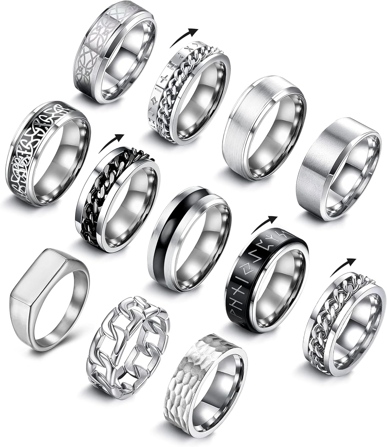 EIELO 12Pcs Mens Stainless Steel Rings Cool Silvery Black Band Ring for Men Women Spinner Chain Fidget Ring Simple Wedding Engagement Ring Set Size7-12