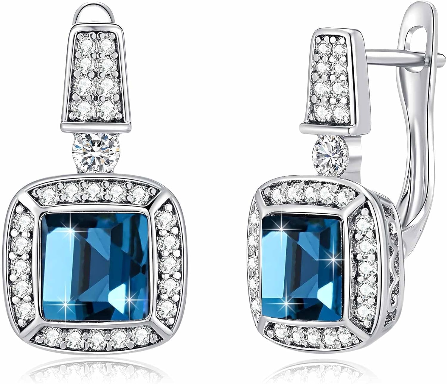 EVEVIC Square Austrian Crystal Earrings Halo Leverback Drop 14k White Gold Plated Earrings for Women Hypoallergenic Jewelry Gift