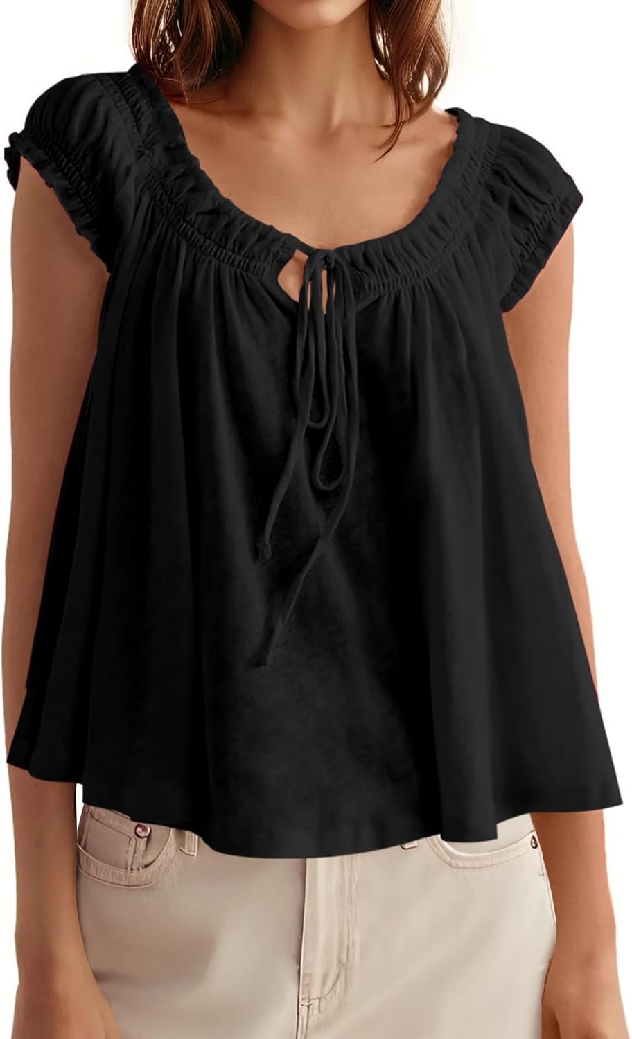 Tankaneo Women Summer Tie Front Tank Tops Cap Sleeve Pleated Babydoll Tops Casual Loose Fit Going Out Flowy Shirt