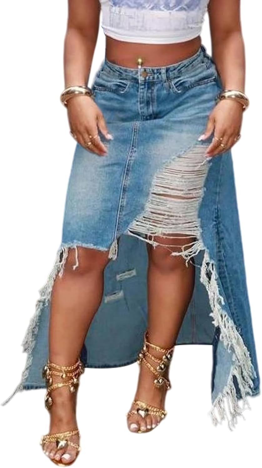 DINGANG Women's Slit Long Denim Skirt High Waist Casual Frayed Midi Jean Skirts with Pockets