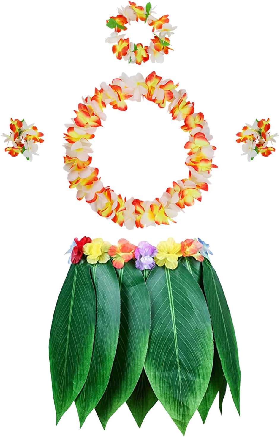 Leaf Hula Skirt and Hibiscus Leis Set Hawaiian Costumes for Beach Luau Party