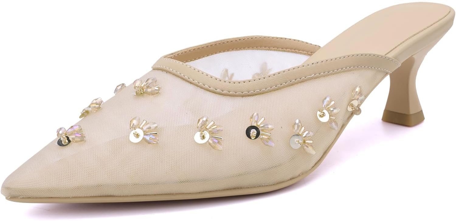 Women's Pointed Toe Mesh Mule Slip-On Kitten Heels - Rhinestone/Flower Embellished, Multiple Colors (Apricot/Black/Light Blue/Tan/Red/White/Nude) - Dress and Party Footwear