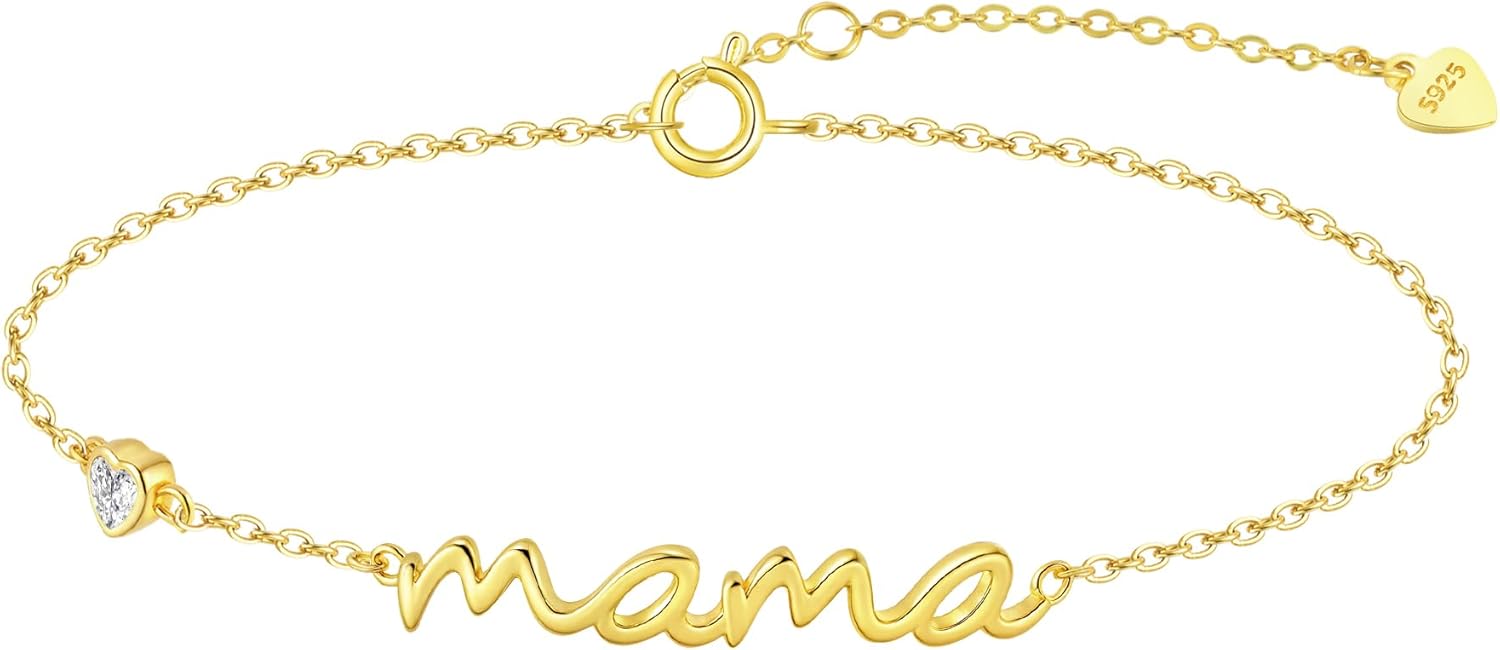 Mama Bracelet for Women 925 Sterling Silver 18K Gold Plated Mom Bracelet for Women with Simple Dainty Mama Initial Bracelets for New Mom Trendy Mother Birthday Christams Day Jewelry Gift from Daughter Husband