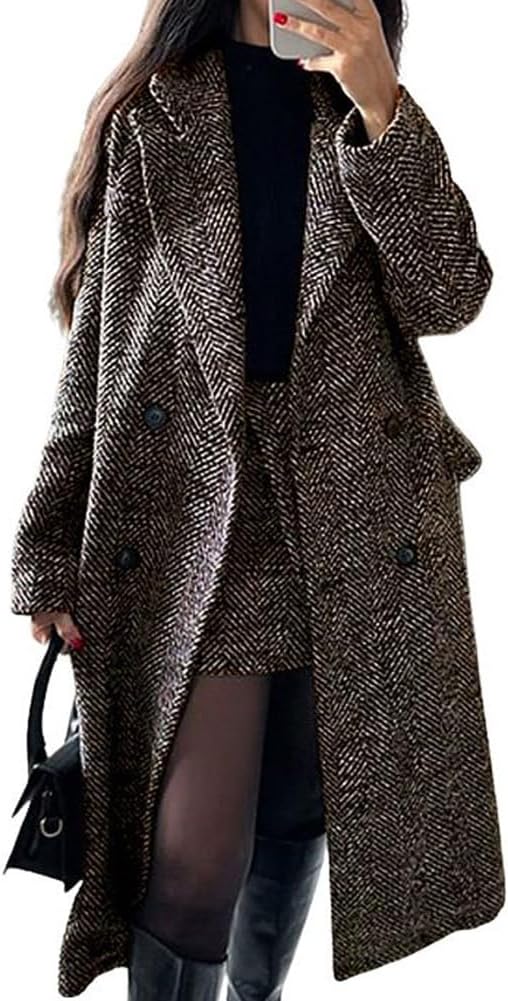chouyatou Women's Winter Casual Herringbone Wool Coat Double Breasted Notch Collar Dressy Long Trench Coat