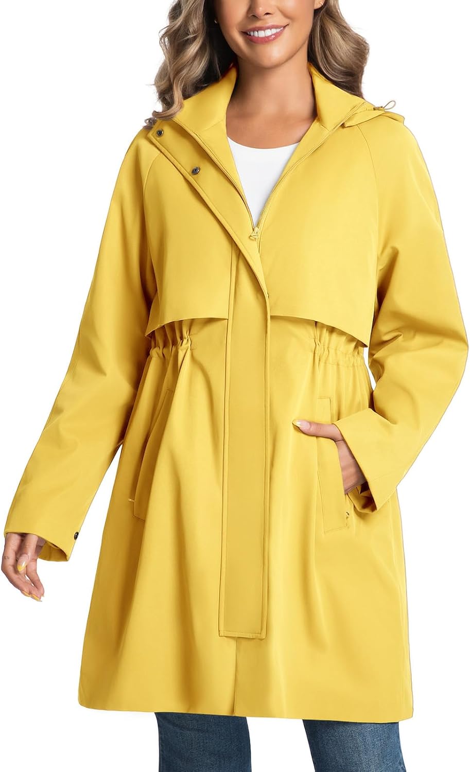 Trench Jackets for Women Lightweight Waterproof Detachable Hood Coat Windbreaker Long Sleeve Raincoats with Belt