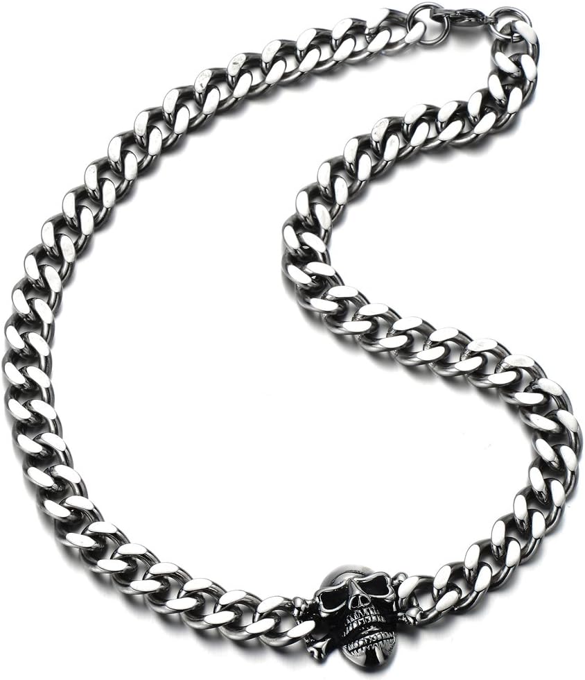 COOLSTEELANDBEYOND Mens Stainless Steel Curb Chain Skull Necklace Silver Color Gothic Style 30.3MM 22 inches