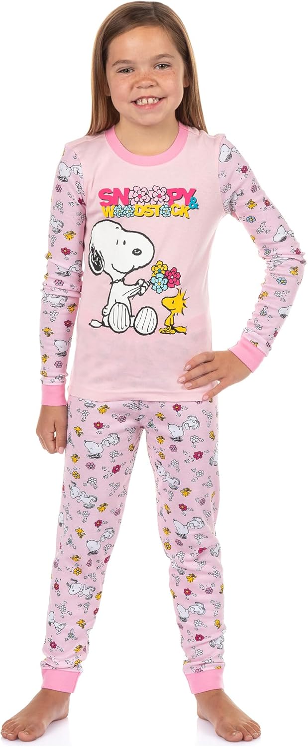 INTIMO Peanuts Snoopy and Woodstock Girls' Pajamas Flower Motif Tight Fit Sleep Set