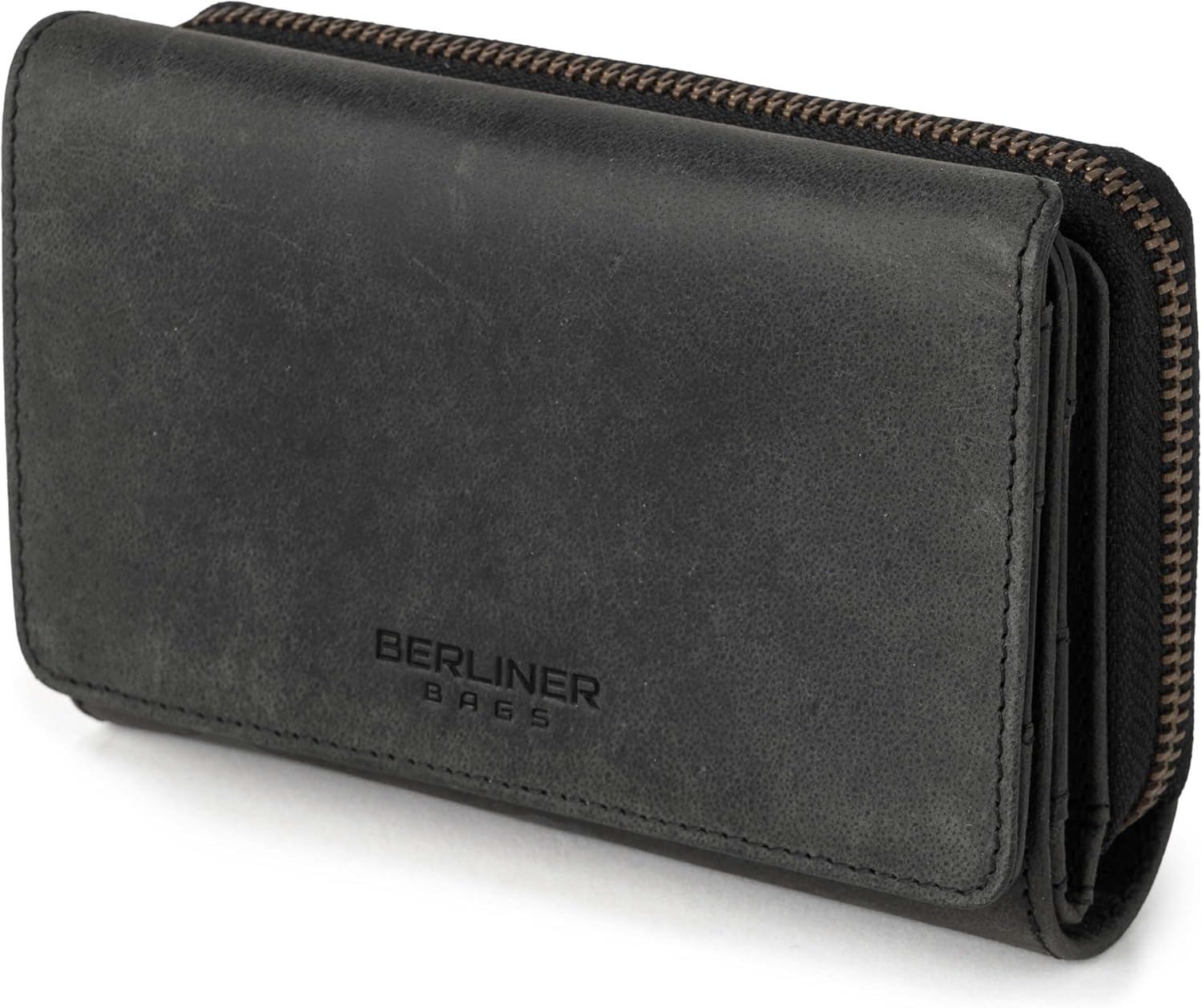 BERLINER BAGS Vintage Genuine Leather Wallet Vienna, RFID Blocking Credit Card Holder, Trifold Clutch Purses, Zip Around Womens Wallet for 19 cards, ID window, Bills, Coins - Dark Grey