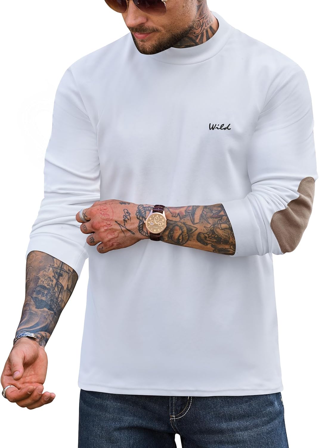 Mens Mock Turtleneck Shirt Thermal Fleece Casual Long Sleeve Base Layer with Elbow Patches (S-XXL)