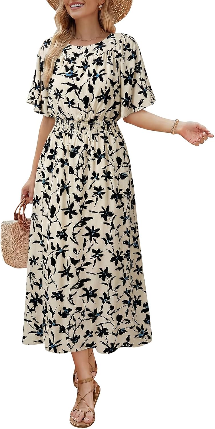 Dokotoo Women's Smocked Waist Print Midi Maxi Dress Flutter Sleeve A-Line Casual Summer Dress