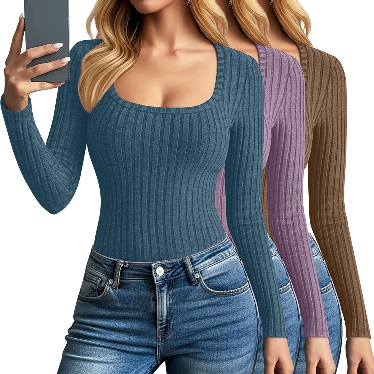 3 Pack Women's Long Sleeve Tops, Scoop Neck Ribbed Knit Shirt Slim Fit Pullover Sweater Casual Basic Thermal Shirt