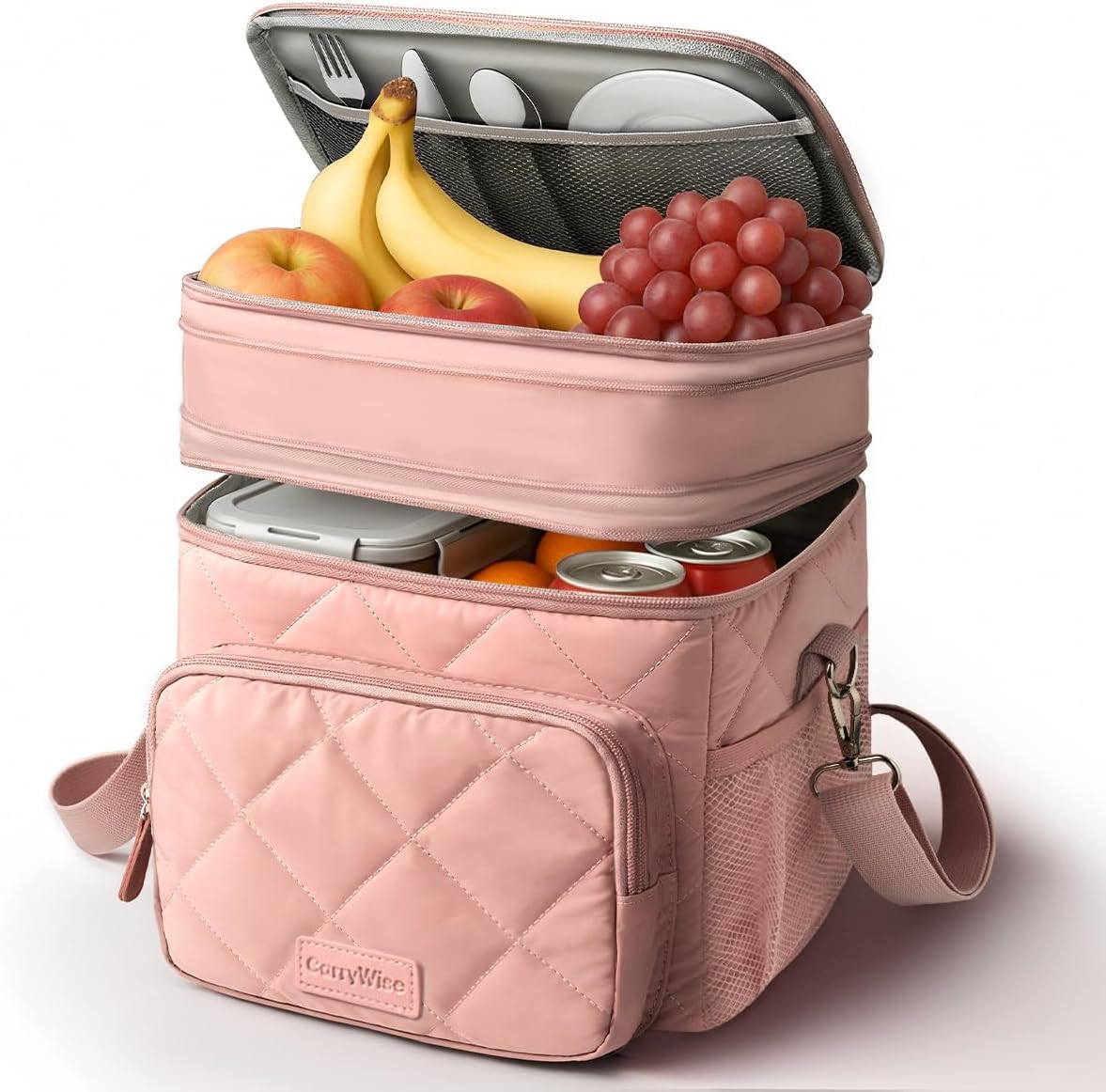Lunch Bag Women Double Layer Lunch Bag Puffer Insulated Lunch Box Waterproof Bottom Large Lunch Box for Women for Work or Travel,Pink